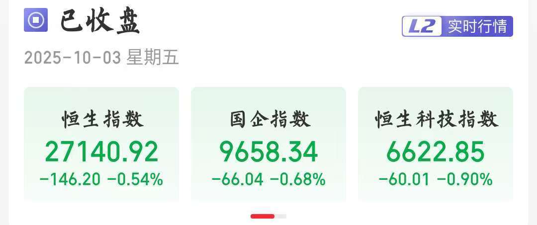 【大河财立方消息】在经历多日上涨后,港股迎来了一波调整。10月3日,港股恒生指数跌0.54%,报收27140.92点;恒生科技指数跌0.90%;国企指数收跌0.68%。