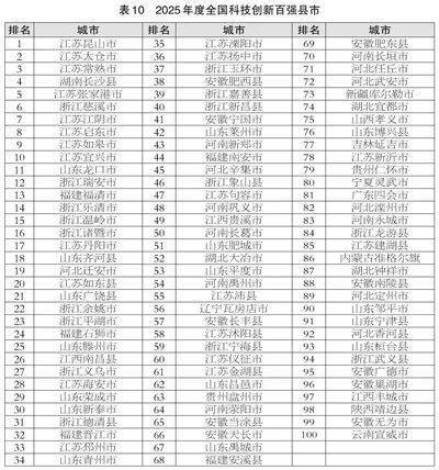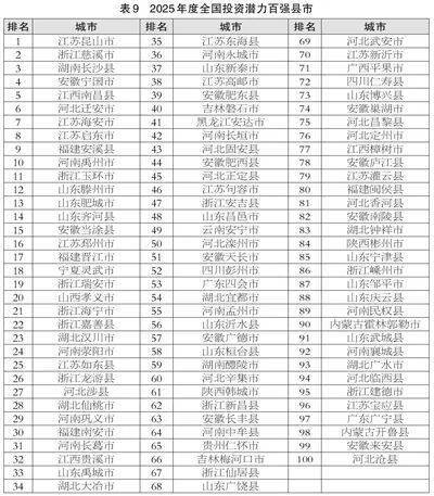 2025年度全国投资潜力百强区、全国科技创新百强区、全国新型城市化质量百强县市等名单及各指数指标体系详情见《中国中小城市发展报告(2025)》绿皮书和中小城市指数网。