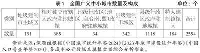 按城市建成区常住人口10万人以上,且建成区和市政设施相对独立、自成体系的地域空间形态定义城市,据中小城市研究院初步汇总,2024年底我国的城市数量超2650个,其中100万人口以上的大城市和特大超大城市有100个左右,10万~100万人口的中小城市有2554个。在这2554个中小城市中,有地级建制市主城区191个,相对独立市辖区政府驻地城镇685个,地级行政区(地区、自治州、盟)政府驻地城镇34个,县级建制市城区342个,县级行政区政府驻地城镇1118个,特大建制镇镇区184个(见表1)。