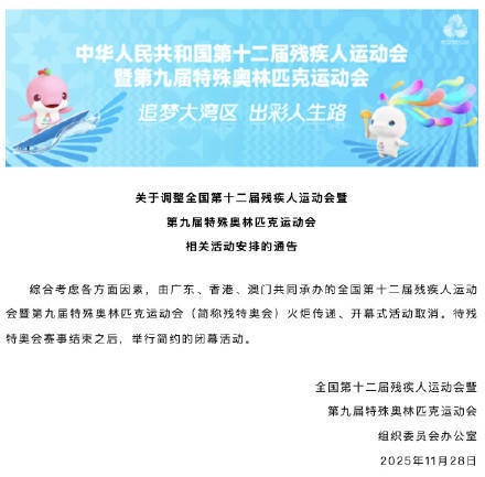 11月28日晚,全国第十二届残疾人运动会暨第九届特殊奥林匹克运动会组织委员会办公室发布通告提到:综合考虑各方面因素,由广东、香港、澳门共同承办的全国第十二届残疾人运动会暨第九届特殊奥林匹克运动会(简称残特奥会)火炬传递、开幕式活动取消。待残特奥会赛事结束之后,举行简约的闭幕活动。