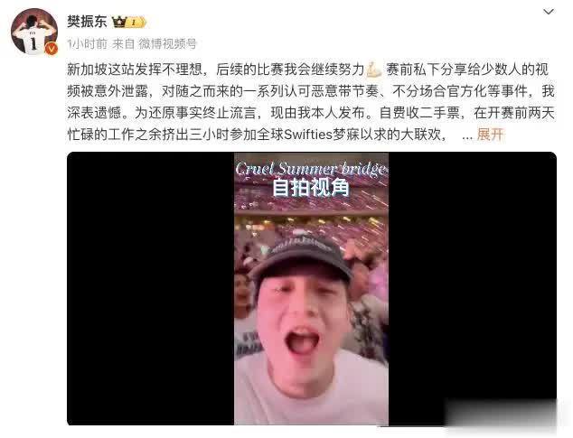 由于赛前曝出了樊振东现身泰勒·斯威夫特(霉霉)新加坡演唱会现场的视频,有网友批评他是因此耽误训练,才导致了比赛的失利。随后,樊振东晒出vlog并发长文正式回应追星风波。